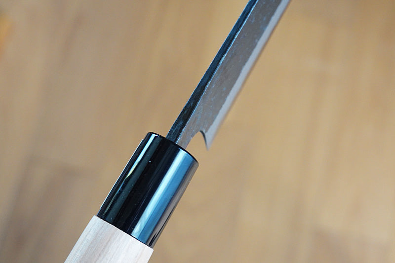This is a Kurouchi(black finish) Santoku knife made from Shirogami steel. Shirogami is a carbon steel, not stainless so it will rust, but it is easy to sharpen and has excellent cutting ability. The rustic appearance is also its charm. Recommended for those who have a whetstone.